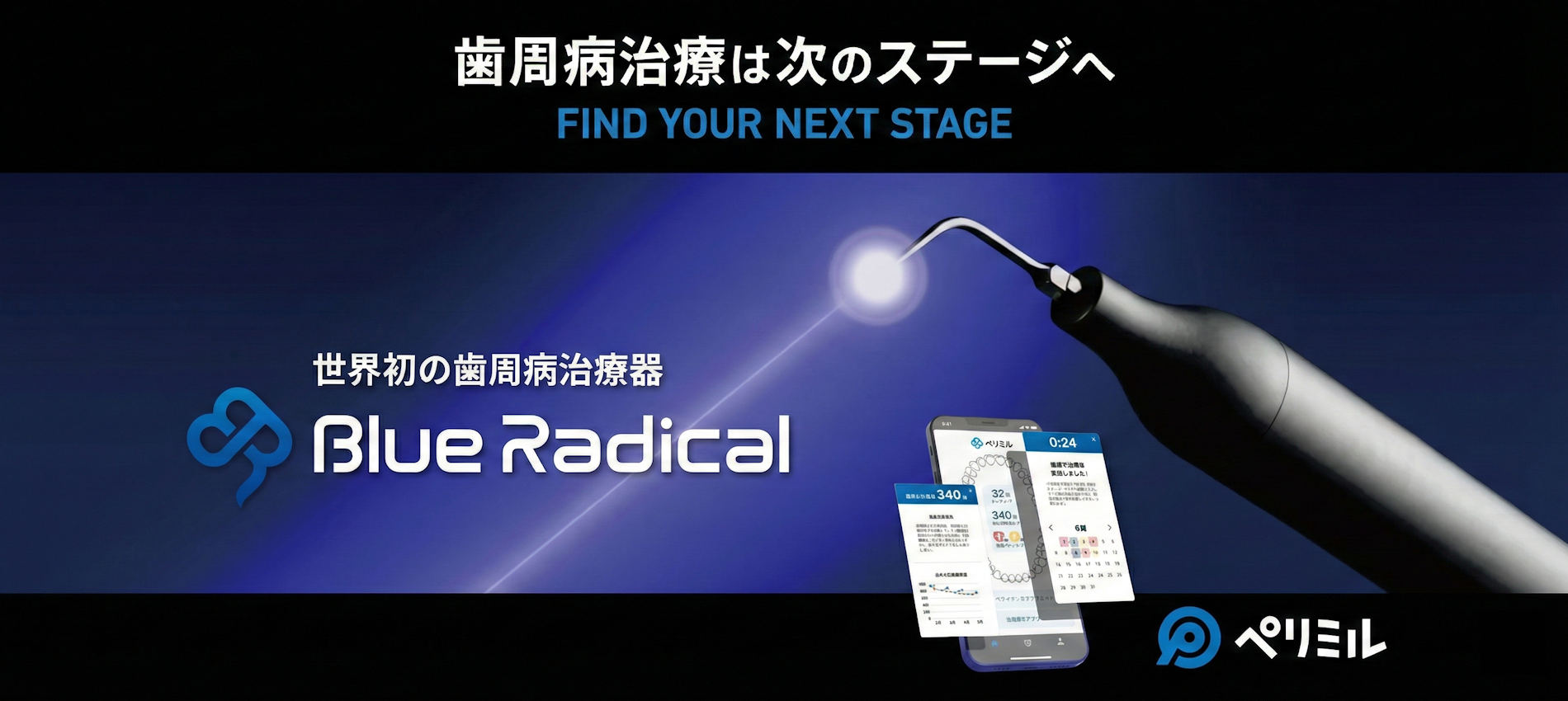 Blue Radicalは、重度歯周病に対する効果を国が認めた唯一の歯周病治療器です。これまでの治療器は、歯周病治療に対する治験を行っていないため、単に歯垢・歯石の除去という使用目的で、明確に歯周病治療に有効であると表現ができませんでした。Blue Radicalは、従来の治療法と比較して、歯周ポケットを優位に減少させることを治験で証明した唯一の治療器です。このためBlue Radicalは、“歯周炎のステージⅢ・Ⅳの患者様に対して、歯周ポケット内の殺菌と同時にスケーリングを行う”という明確な使用目的と、“歯周ポケットの減少”に対してコミットする初めての治療器になります。