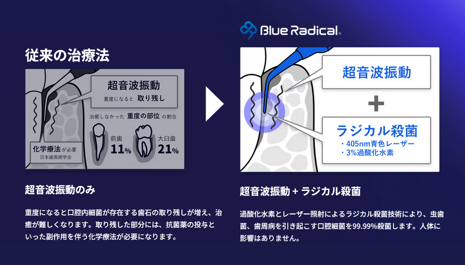 従来の歯周病治療では、スケーリングなどの処置や外科的手術による対応が中心で、患者様への負担も大きく、再発リスクも抱えていました。一方、ブルーラジカルP‑01は根本原因であるバイオフィルムをラジカルで化学的に除去し、かつ治療を非外科的に行えるので、患者様と医院の双方にとって、より負担が少ない治療を提供できます 。