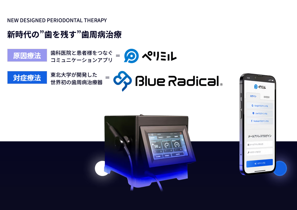 「ブルーラジカルP‑01」は、東北大学・菅野太郎教授が17年にわたる研究の末に開発した世界初の非外科的歯周病治療器です。3%過酸化水素と405nmの青色光を同時照射することで、バイオフィルム内の細菌を99.99%除去するラジカル殺菌を実現し、超音波振動と連携して効率的に歯石除去を行います。これまで外科手術が必要とされてきた重度歯周病を、切らず抜かずに治療可能にする画期的な技術です。